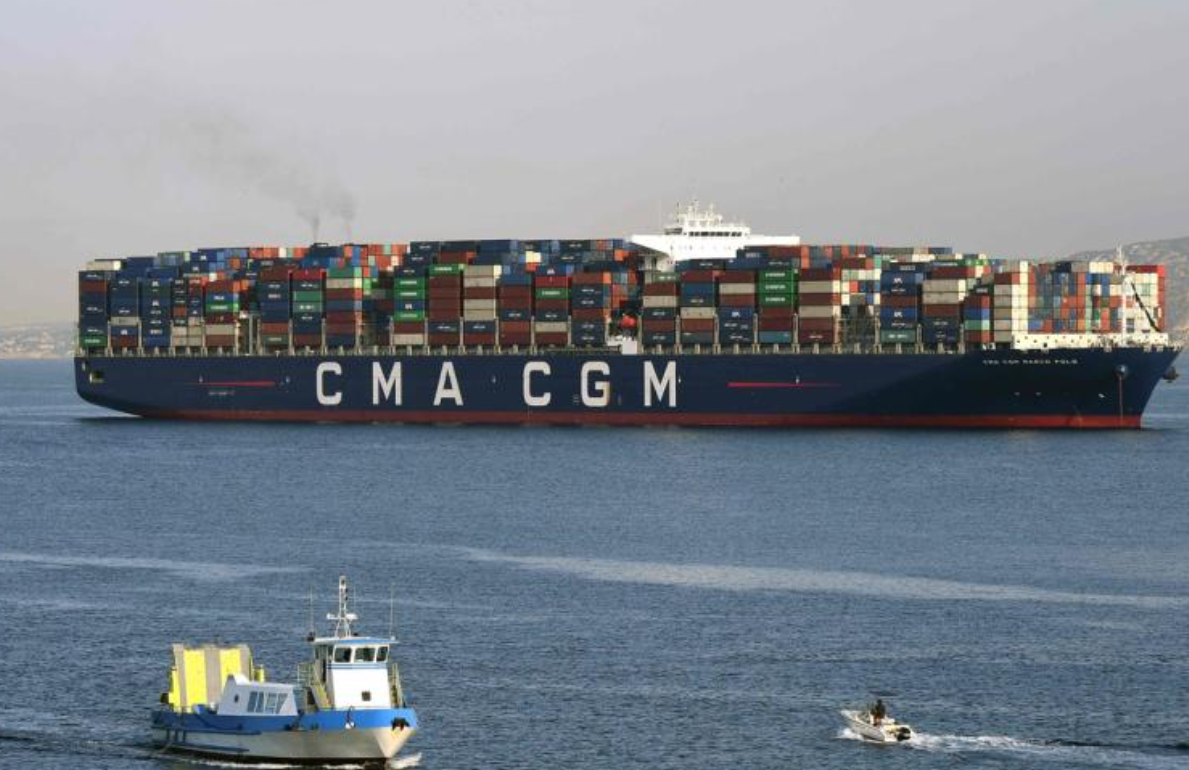 2026年4月3日,一艘标注“法国船东”的CMA CGM集装箱船通过霍尔木兹海峡。